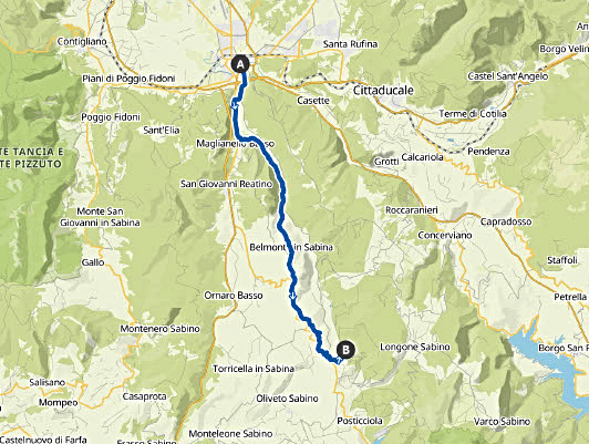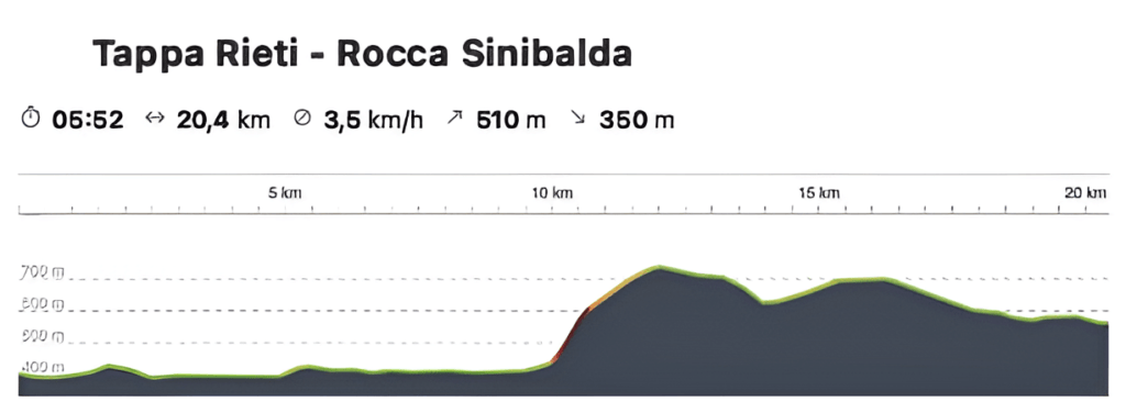 La tappa di 20,4 km parte da Piazza San Rufo, una piazza nel centro di Rieti. Secondo un’antica tradizione risalente al Rinascimento, si crede che il centro d’Italia si trovi in questa piazza, basandosi sui classici della letteratura latina che indicavano il reatino come l’Umbilicus Italiae. Una volta lasciata Rieti, si segue il sentiero lungo il fiume Turano e si affronta una salita impegnativa fino a Belmonte in Sabina, un piccolo e pittoresco borgo con 627 abitanti. Questo borgo si trova su un crinale che affaccia su la Valle del Turano e la Salaria. Dopo Belmonte, si continua lungo un crinale panoramico fino a Rocca Sinibalda.