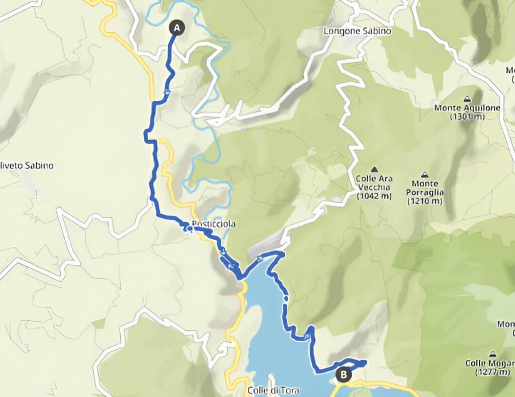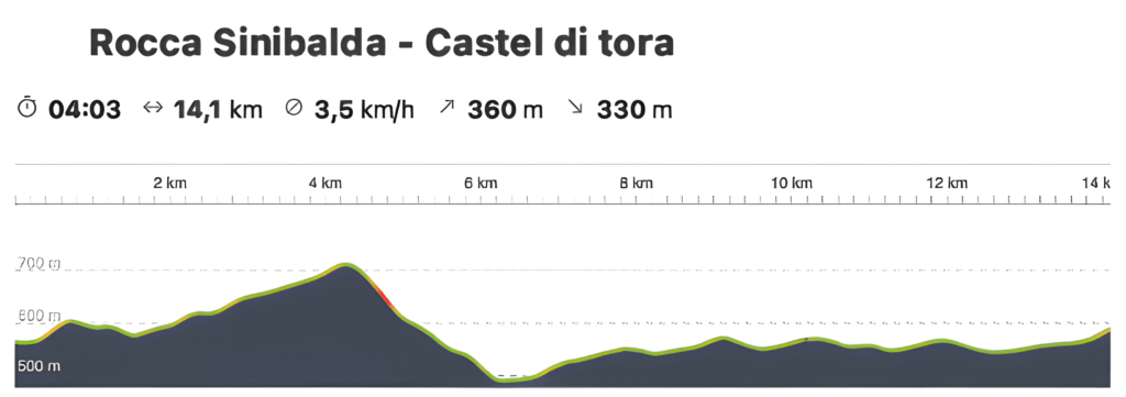 La tappa di 14,1 km inizia a Rocca Sinibalda nella Piazza della Vittoria e termina a Castel di Tora nella Piazza San Giovanni. Rocca Sinibalda si trova sui colli dell’Alta Sabina, a un’altitudine di 552 metri. Circondata dal verde dei boschi e affacciata sulla valle del fiume Turano, questa località conta 791 abitanti. Lungo il percorso si attraversa il suggestivo borgo di Posticciola, che rappresenta un ottimo punto di sosta e ristoro. Posticciola è custode di monumenti interessanti e offre panorami incantevoli. Situato a un’altitudine di 544 metri, è uno dei centri più caratteristici di questa parte della Sabina. Tra le attrazioni da non perdere ci sono il centro storico e il Museo delle Tradizioni Contadine e Artigiane.Dopo aver superato Posticciola si passa per la diga del Turano e il suggestivo lago omonimo proseguendo lungo una strada chiusa al traffico che costeggia il lago. L’obiettivo finale della giornata è Castel di Tora, una meta affascinante.